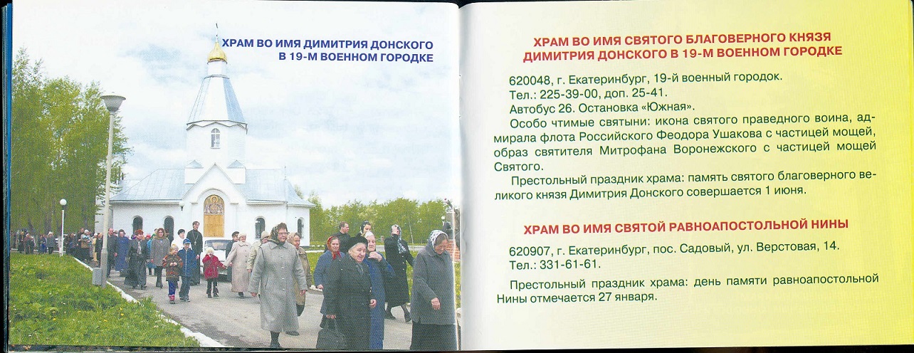 Информационно-издательский отдел Екатеринбургской епархии Тираж 1000 экз Подписано в печать 19.04.2006 Размер буклета: 135х103 мм 26 листов Для примера - разворот с информацией о храме во имя Димитрия Донского в 19-м военном городке: ![]() |