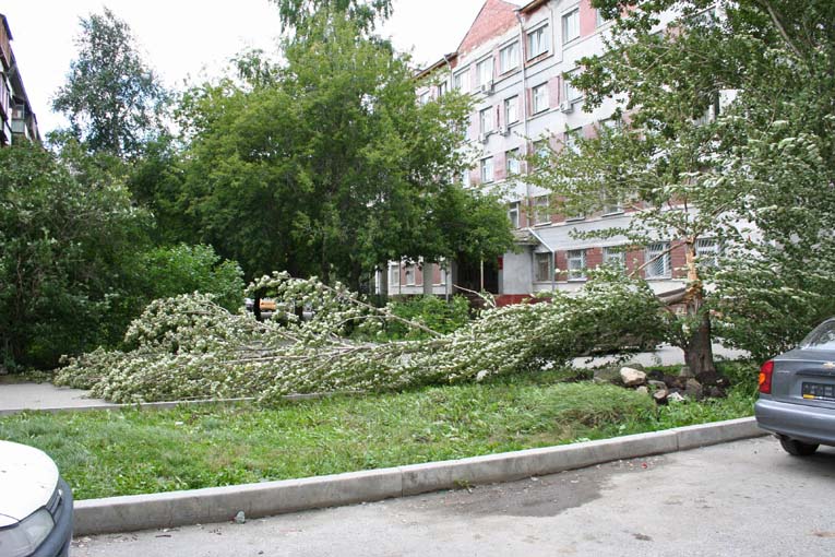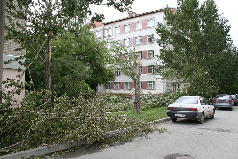Сломанные тополя от сильных порывов ветра во дворе дома на Папанина.