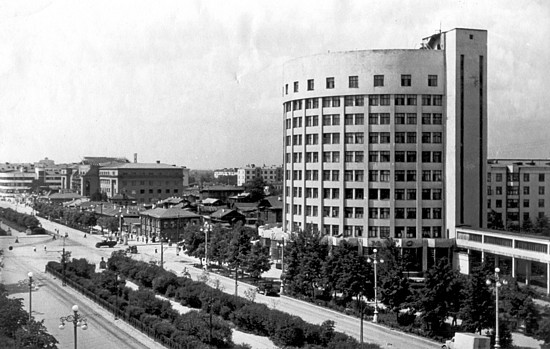 Ну раз написано "Дом коммуны", то Кирова 31, на нем и табличка есть. Или была... Не снесли ли дом еще? Он был на углу Кирова/Токарей. Единственный оставался. Только что-то по снимку не сходится... Вроде по Кирова в то время трамваи ходили, а тут вообще како-той переулок тупиковый. Хотя вдали какие-то заводские сооружения просматриваются Здание по Кирова, 31 сохранилось. Оно стоит на углу Кирова-Токарей. Но на фото другое место. На снимке виден столб электрофикации трамвайного пути. А трамваи ходили по ул.Кирова. |