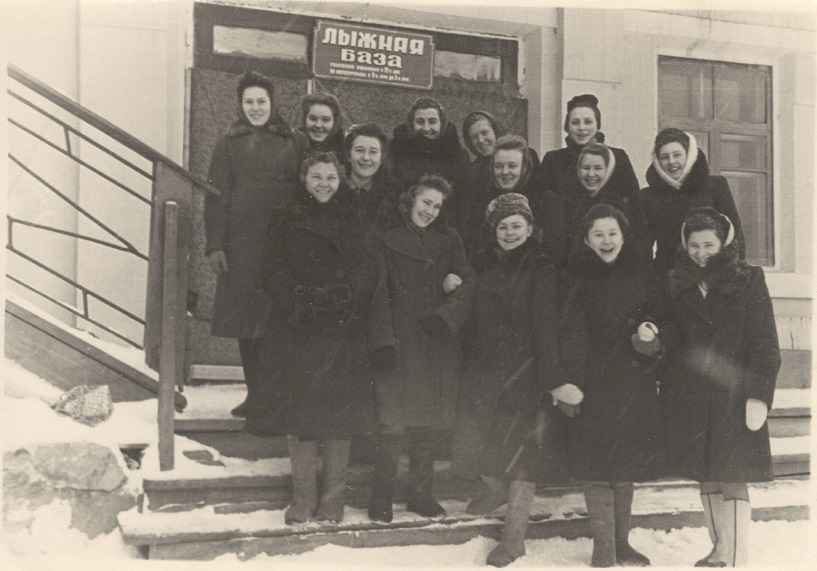У ворот водной станции на ВИЗе. Где-то там же и лыжная база. Весёлая компания. |