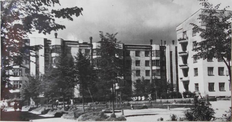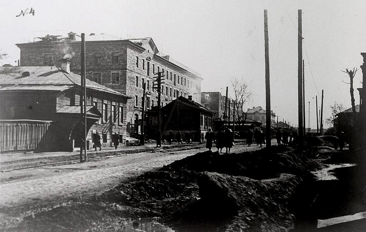 1948 г. Фотограф Шишкин И.А. Перспектива нечётной стороны проспекта Ленина. На дальнем плане корпус общежития (гостиницы) жилкомбината. ![]() Вид на корпус общежития (гостиницы) с перекрёстка просп. Ленина и ул. Луначарского. ![]() госкаталог.ру |