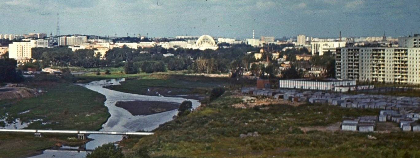 Недостроенная телебашня достигла высоты 30 м к июню 1987 года. на фото её нет - значит снято раньше. Получается, диапазон съёмко - 1981-1987 годы. Попробую расшифровать отдельные здания на фото. Снято, скорее всего, с колеса обозрения в ЦПКиО, направление съёмки - северо-запад. Тёмный шпиль справа за девятиэтажкой Луначарского 225 - Шпиль мэрии/горсовета. Левее труба - бани на Куйбышева. Левее высокая полосатая труба - дымовая труба ВИЗа. Цирк - понятно, левее - осветительные мачты Юности, либо Центрального стадиона. Вышка слева - мачта на Московской горке, чуть левее неё - храм в Зелёной роще. |