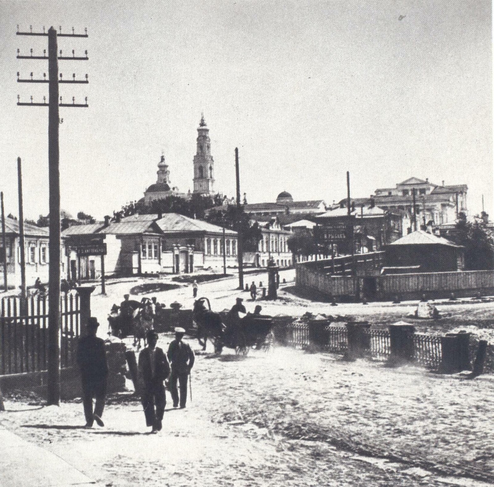 Арсеньевский проспект (улица Свердлова). Мост через речку Мельковку. На заднем плане - ансамбль дома Расторгуева-Харитонова и Вознесенская церковь. Фотография начала XX века.