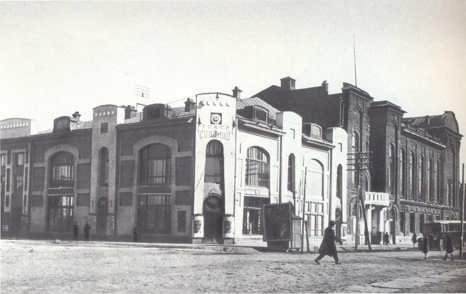 Главный проспект (Ленина). На углу - кинотеатр. 1907. Архитектор К. А. Полков. Рядом по Главному проспекту - Коммерческое собрание (клуб приказчиков). 1915. Архитектор Лебединский. Фотография 20-х годов XX века.