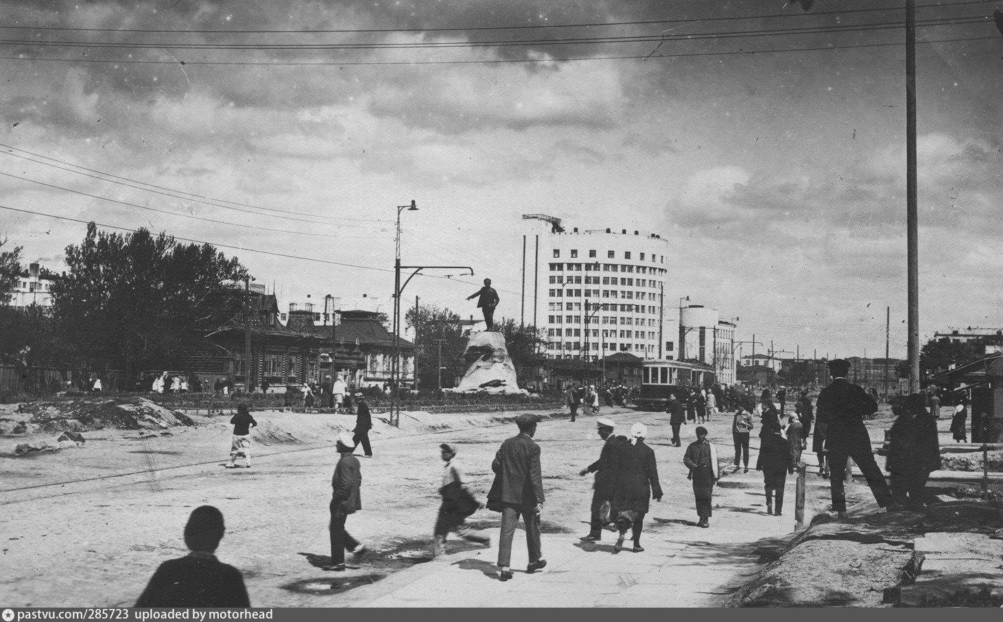 Проспект Ленина. Памятник Свердлову. 1930-35 г. На этом месте, напротив Оперного театра, располагалась деревянная застройка. Причём квартал был из неблагополучных — здесь находилась пивнушка, на которую указывал бронзовый Свердлов… Жители шутили — мол, приглашает.