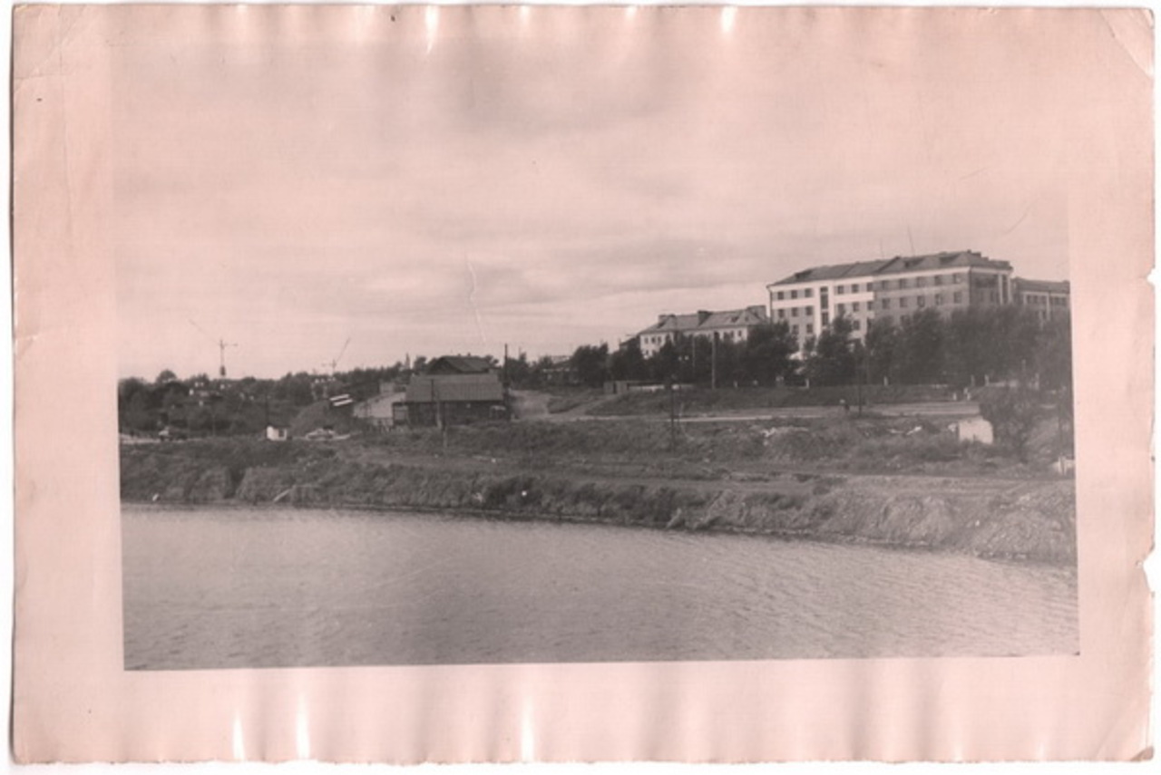 Вид на городской пруд и ул. Гражданскую в г. Свердловске. Фрагмент панорамы учебного корпуса УЭМИИТ (Уральский электромеханический институт инженеров транспорта). 1960-е гг.