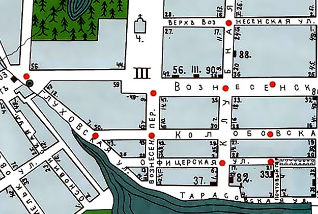 Бывшая ул. Глуховская. Ныне безымянная пешеходная дорожка между ул. Толмачёва и К.Либкнехта. Фотография советского времени, но т.к. советских изменений особо не наблюдается, помещена в дореволюционную тему. Мостик ведёт видимо на ул. Турчаниновскую (ныне парковка за Космосом). Глуховская набережная Глуховская набережная, соседние дома №3 и №2. С фото 30-х годов Электронного архива УрГУ. Кусочек карты 1910 года с Глуховской улицей. |