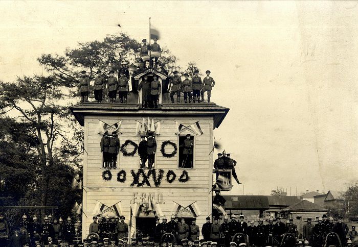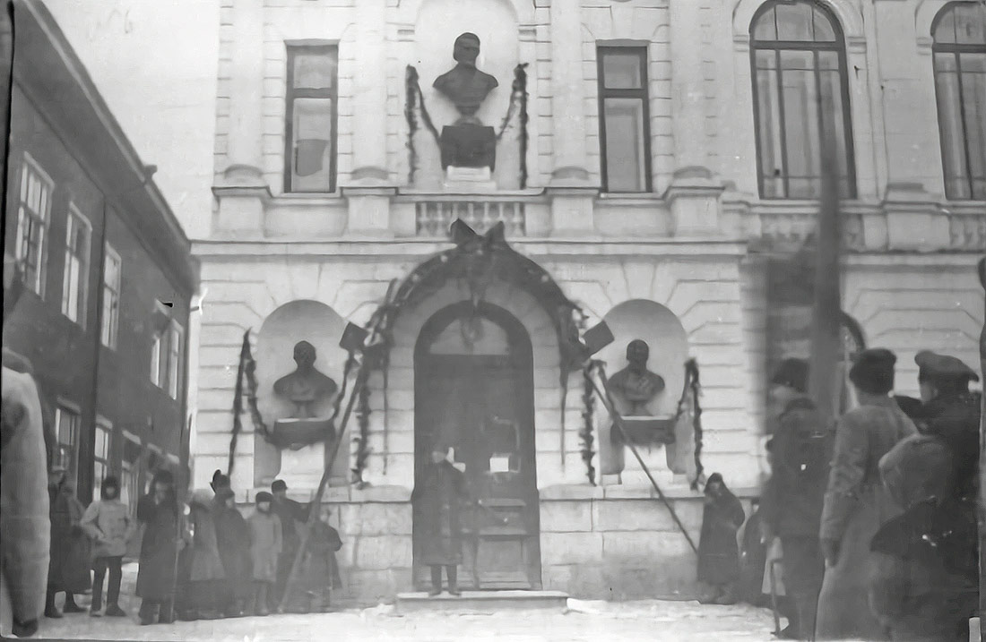 Открыты бюстов Белинского, Мамина-Сибиряка и Решетникова на фасаде библиотеки им.Белинского (вероятно 1920 год). Архив СОКМ.