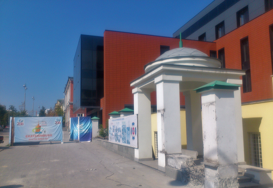 Музей на Плотинке. Внутри, говорят, работы еще непочатый край. Под фанерным ящиком - бюст Петра 1. Теперь памятник будет стоят здесь.