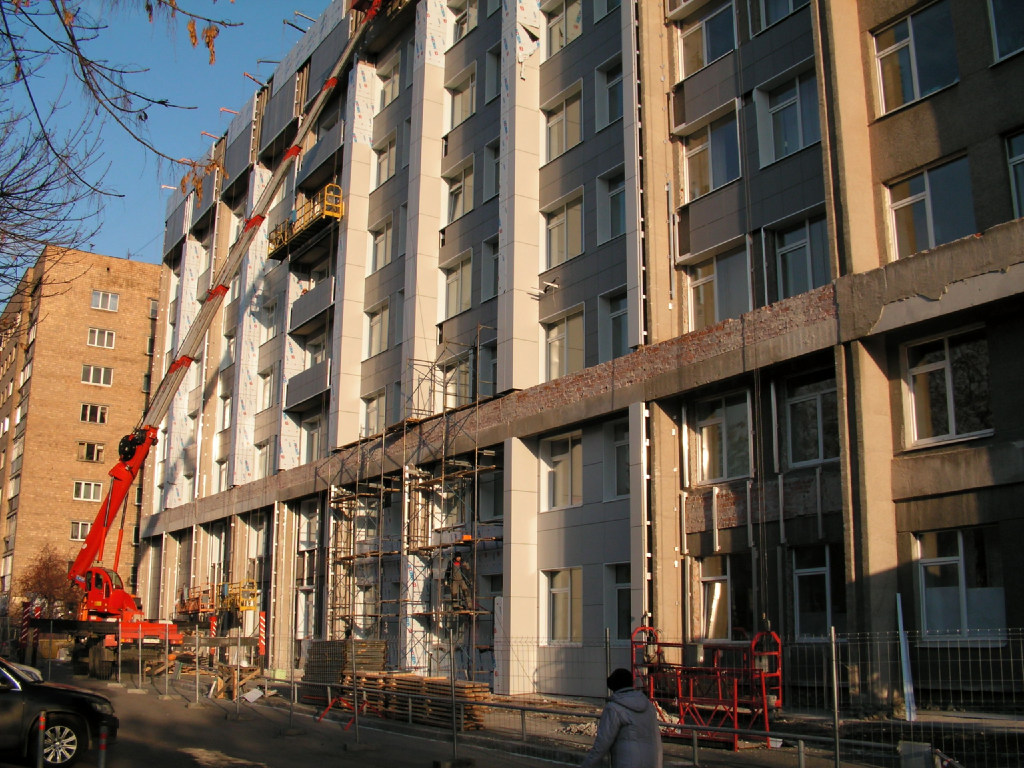 Фрагмент фронтона отремонтированного здания Института ОММ, смотрящий прямиком на новую улицу Татищева и строящийся новый "Хаятт"...