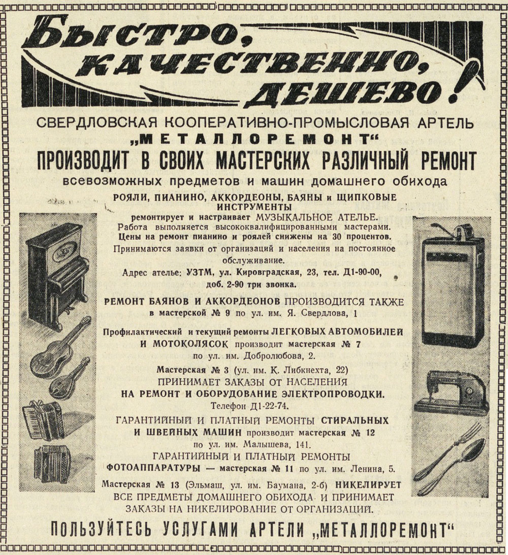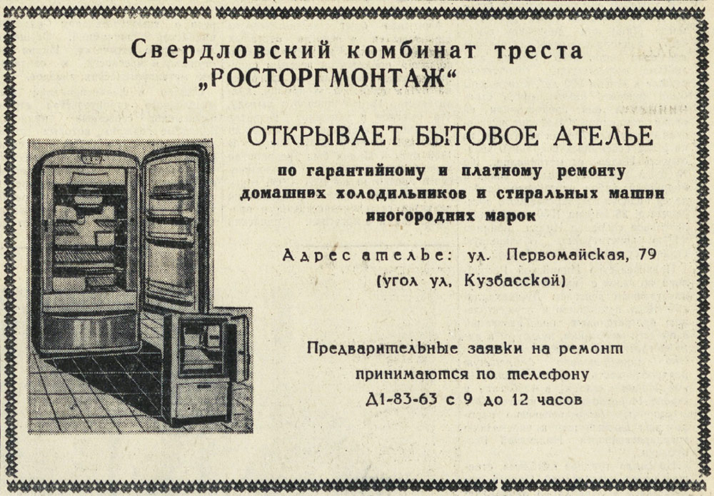 по ремонту домашних холодильников и стиральных машин. "Вечерний Свердловск" 25 января 1958г. ![]() |