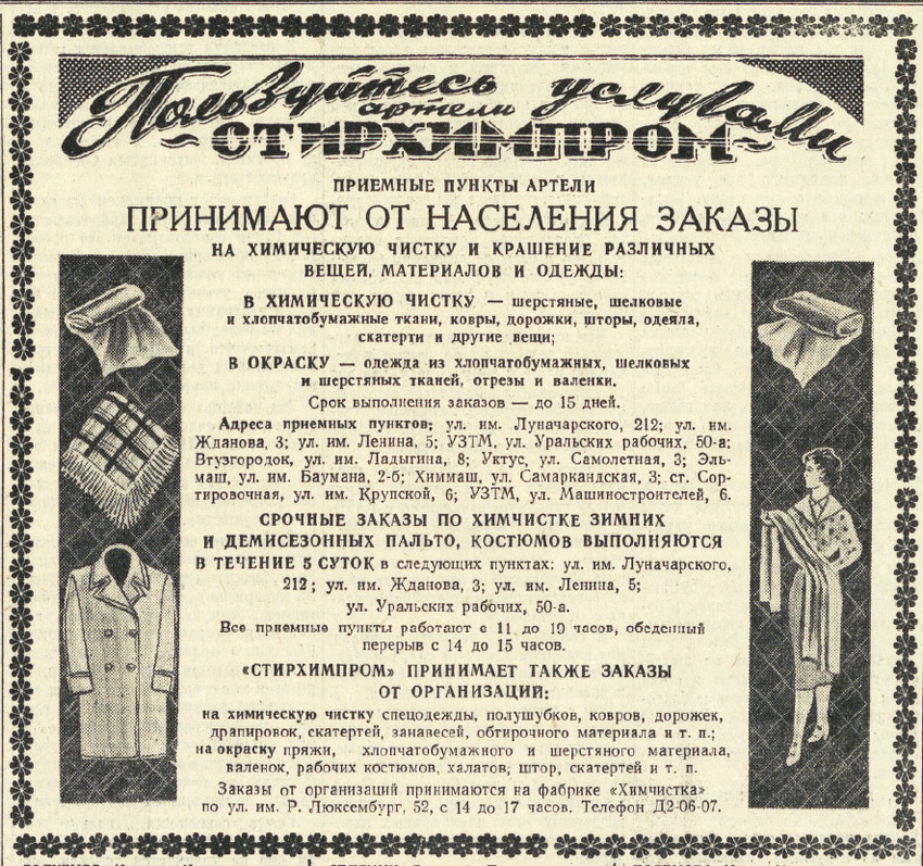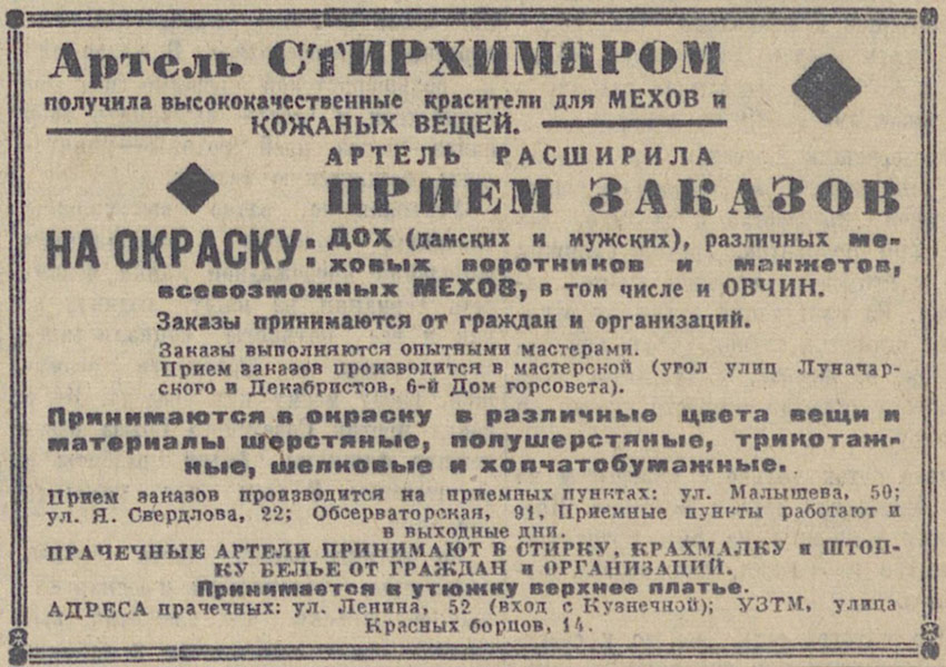 Фабрика "Химчистка", ул.Розы Люксембург, 52. "Вечерний Свердловск" 27 января 1958г. ![]() |