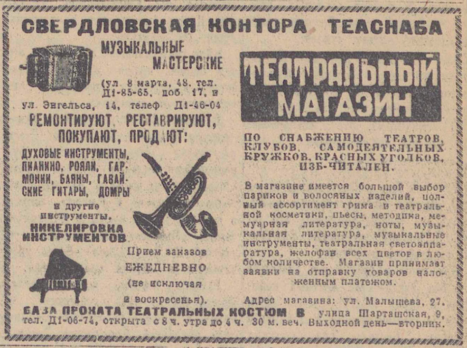 Музыкальные мастерские (8 Марта, 48; Энгельса, 14). Театральный магазин (Малышева, 27). База проката театральных костюмов (Шарташская, 9). "Уральский рабочий". 21 января 1941г. ![]() |