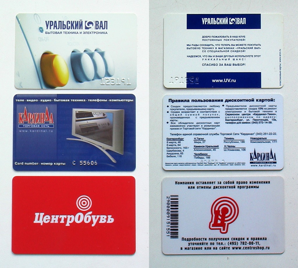 Дисконтные карты магазинов "Уральский вал", "Кардинал" и "Центробувь"