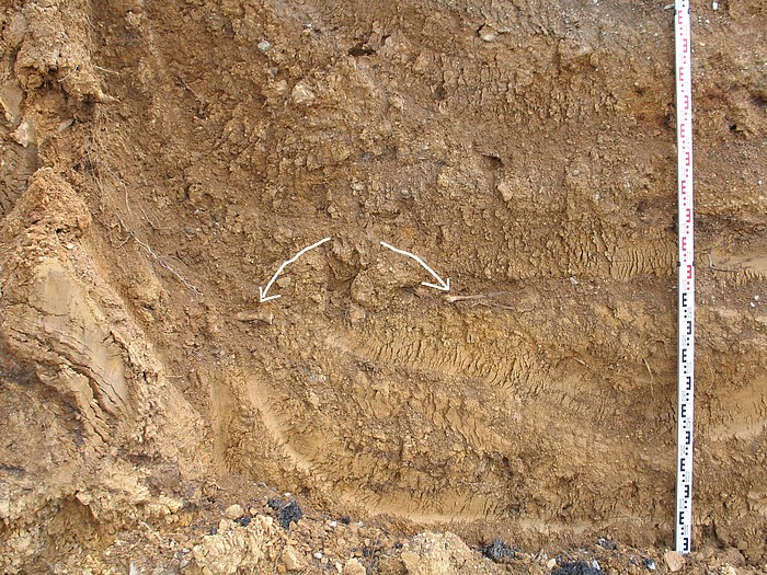 Фото 14. Юго-восточная часть котлована. Погребение № 3: торцевой срез деревянной колоды. То есть, видите здесь такой как бы полумесяц черный? В центре..