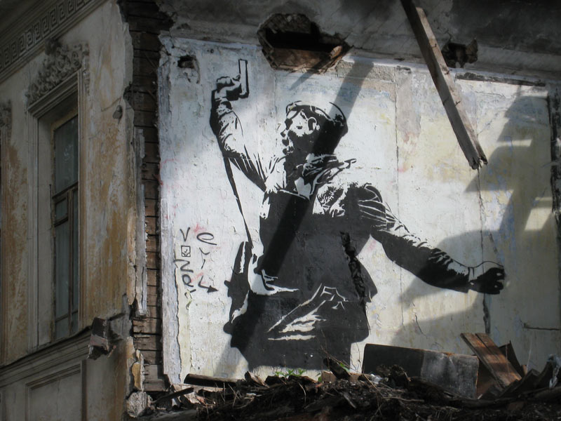 Каждый день еду по Р.Люксембург и мечтаю сфотографировать очень оригинальное граффити: его можно увидеть, если идти от перекрестка с Декабристов. На правой стороне будет полуразрушенный дом, и на его стене граффити на основе известной фотографии ВОВ.