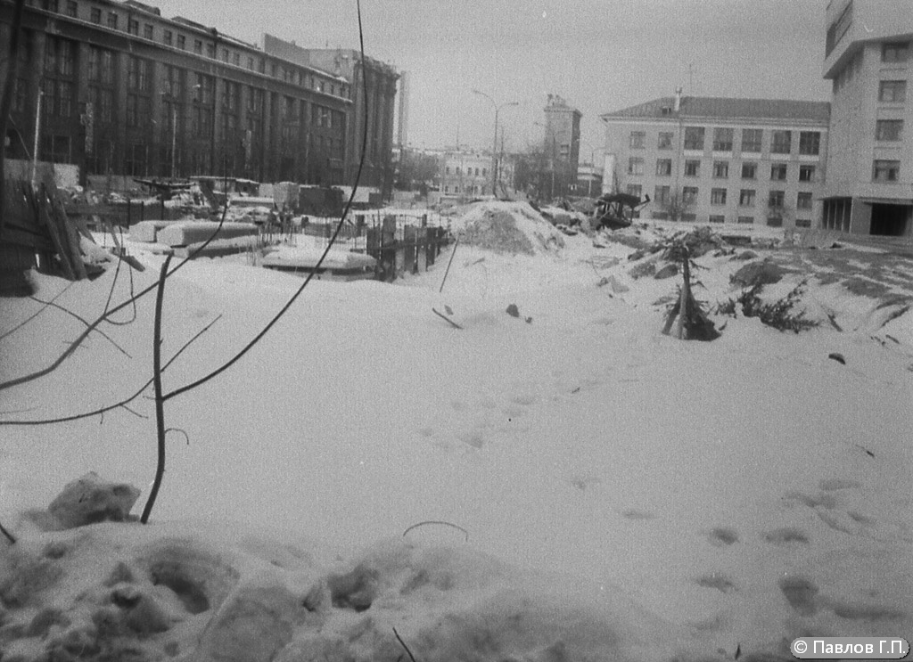 Значит, это между 1967 и 1969 годами (пристрой уже есть, расчищают место под Дом политпросвещения) ? Вторая половина 80х - расчистка под строительство станции метро площадь 1905 года. Точнее даже конец 1988 - начало 1989. Мне кажется, что эти дома сломали в январе-марте 1989. |