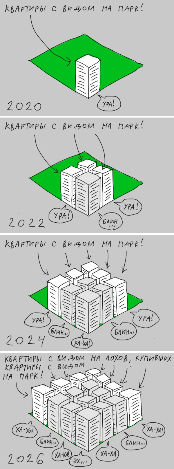 ЖК Даблхаус "1:1". Застройщик: «Астра». Ул. Репина, 24. Эти современные застройщики абсолютно архитектурно безграмотные! Зачем строить два высоченных дома на одной линии на расстоянии 10 метров друг от друга? Ведь ежу понятно, что жильцы одного дома будут напрямую смотреть в окна другого, а один дом будет перекрывать второму солнечный свет, и в квартирах будет всегда темно. Можно ведь было поставить дома углом друг к другу (в шахматном порядке), тогда вышеназванных проблем бы не было. Но застройщик, вероятно, считает будущих жильцов не своими кормильцами, о которых нужно всячески заботиться, а "лохами", которых можно разводить на "бабки". И ведь самое удивительное, что квартиры-то покупают! С окнами в стену, без солнечного света, без парковочных мест. Люди совсем себя не уважают. Хотя многие покупают квартиры не для себя, а чтобы потом перепродать подороже таким же "лохам". Вспомнилась картинка: ![]() Взято здесь. |