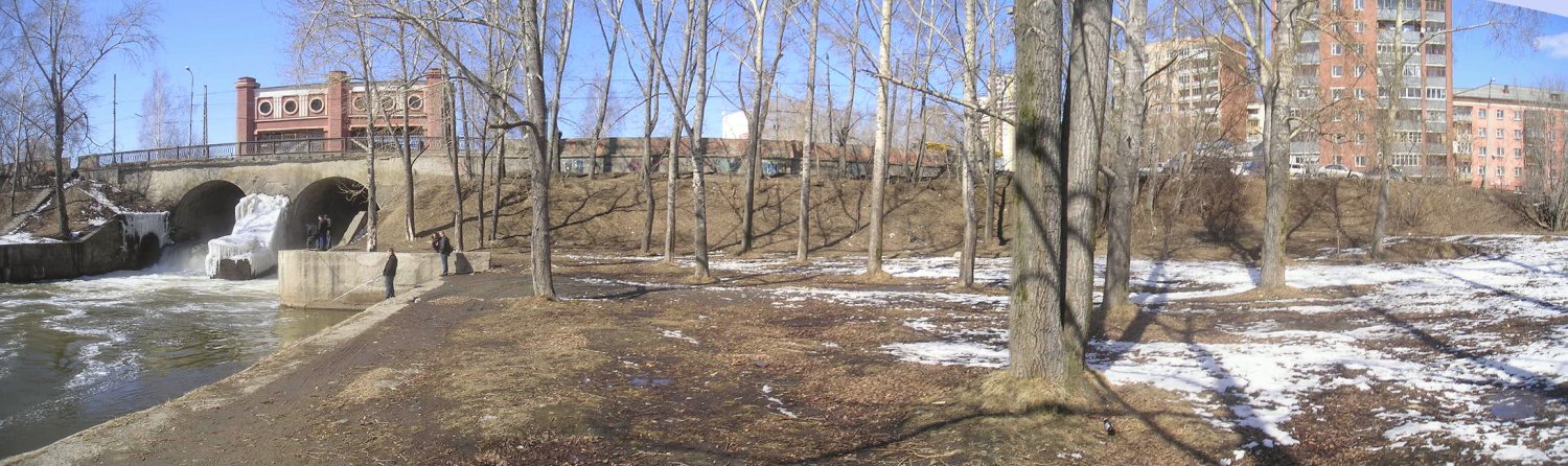 В левой части панорама захватывает известный дом по Косарева 1а (он тоже есть на старинной фото).Ну а посередине панорамы - пустырь ,на котором раньше были два цеха старинного завода ,рабочий прорез и заводь перед цехами. Необходимо отметить ,что в рабочий прорез между цехами находился точно по центру этой панорамы.Я специально сделал такой вид .Рабочий прорез - это дополнительного отверстия в плотине ,менее глубокого чем основные прорезы(лари) ,по которому вода подавалась по лоткам (типа труб) в цеха.Сейчас этот прорез ,как мы видим по панораме ,полностью засыпан. Есть догадка ,что когда цеха разрушили и продали на кирпич,то чтобы скрыть это неблагодарное дело, разрушили рабочий прорез ,его лотки .Вода хлынула и затопила все пространство которое мы видим на панораме.Отсюда и слухи в книжках ,что Нижне-Исетский завод был затоплен. Прикрепленные изображения