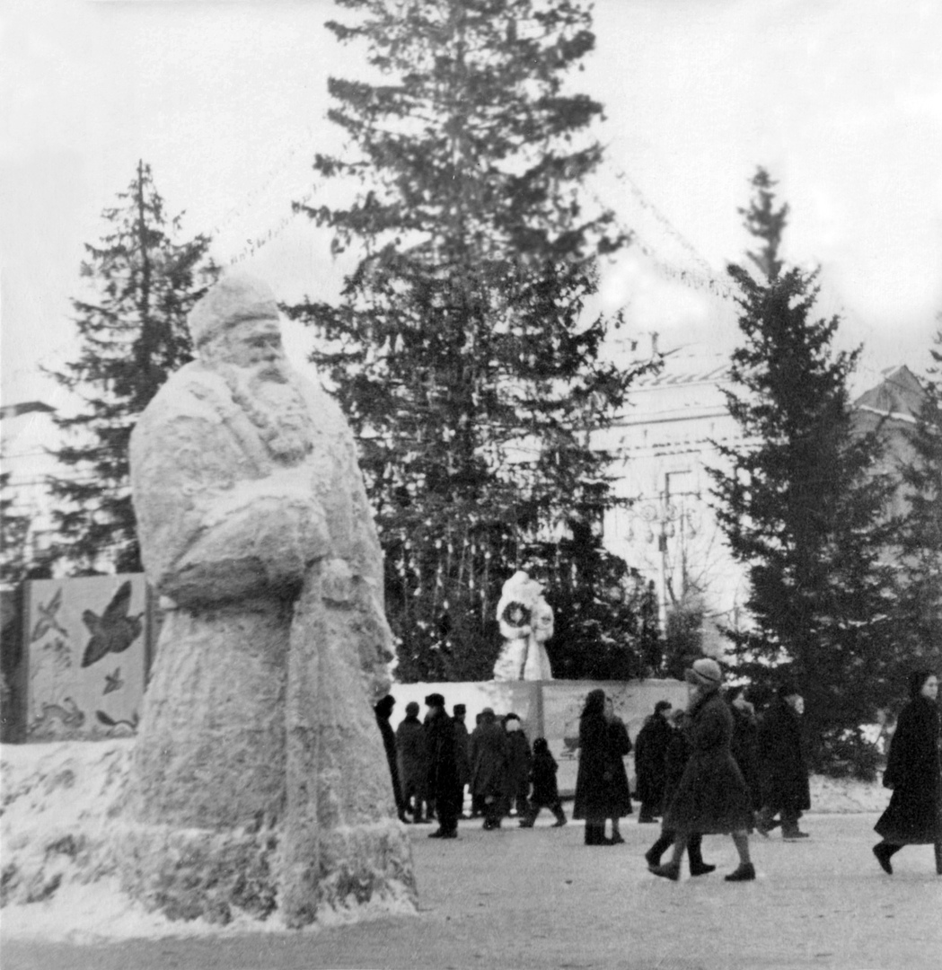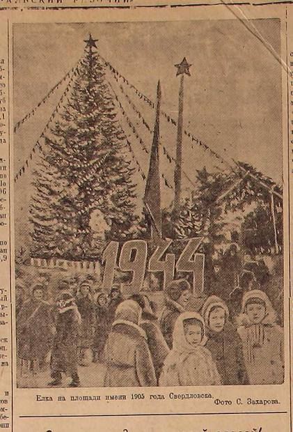 Цитата Мы нашли в «Уральском рабочем» от 27 декабря 1937 года заметку о том, какой была предновогодняя площадь 1905 года. «Площадь 1905 года в Свердловске за последнее время стала необычайно привлекательным местом для юных свердловцев. Еще бы! На ней в эти дни шло такое интересное строительство, как киоски для новогоднего ёлочного базара! Конечно, ёлочных украшений немало в универмаге Наркомвнуторга, в "Детском мире" и других магазинах, но ведь совсем иное дело покупать те же бусы, картонажи, шарики в киоске-"ледоколе", теремке с картинами из пушкинских сказок или киоске, вокруг которого пляшут три поросёнка! И конфеты, наверное, гораздо вкуснее в снежном доме Гастронома, чем в других магазинах! И в каком магазине, клубе уместится такая большая ёлка, как та, которая поставлена посередине площади при помощи тросов и лебедки! Вечер... Наверху ёлки загорается яркая алая звезда, вспыхивают огоньки иллюминации на киосках. Ёлка сверкает разноцветными огоньками, искрится нитями бус. Внизу, к восторгу детворы, стоит большой медвежонок и дед-мороз с полной торбой подарков». На фото — ёлка 1942/1943, 1943/1944 годов. ![]() ![]() Источник |