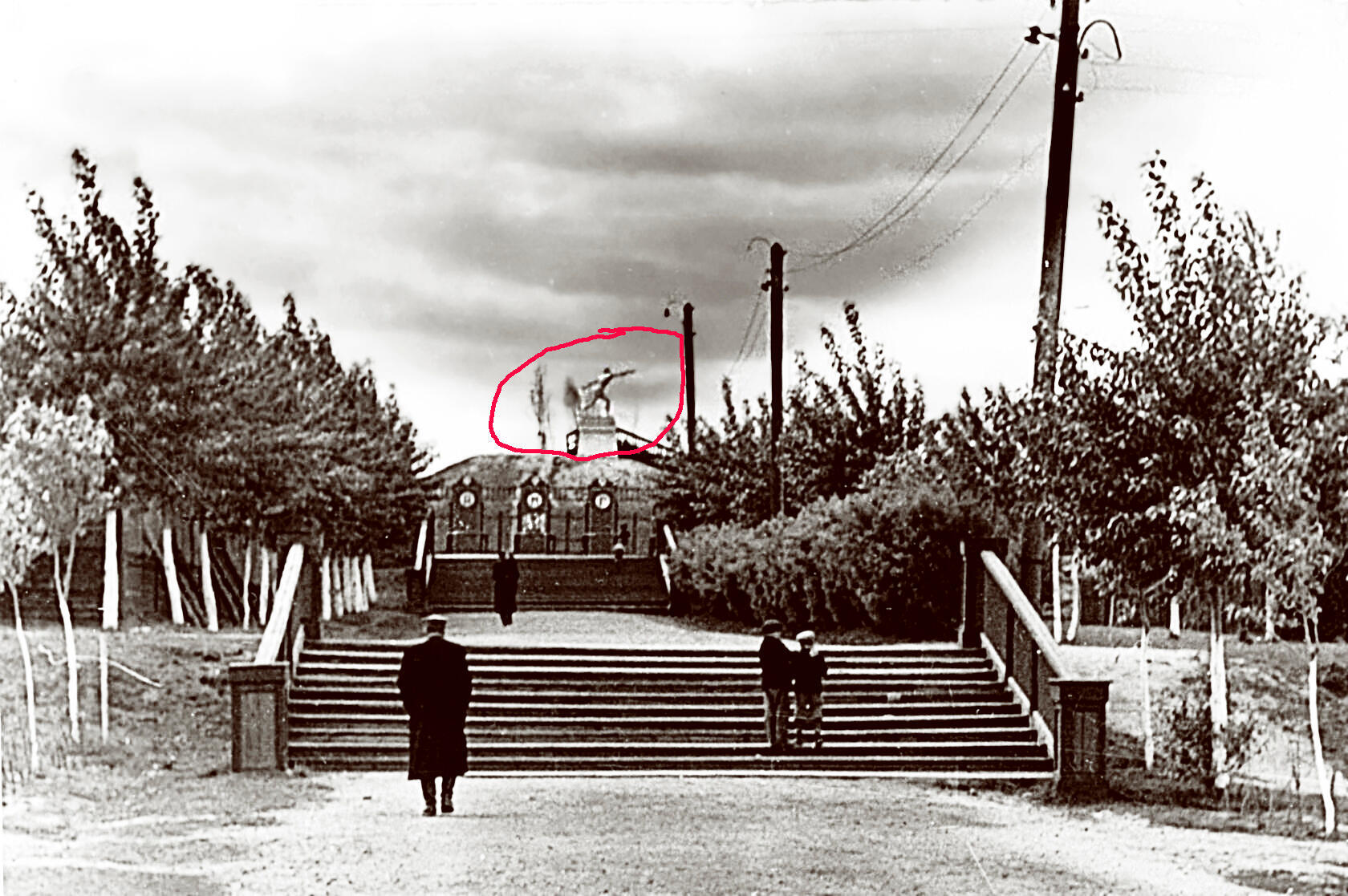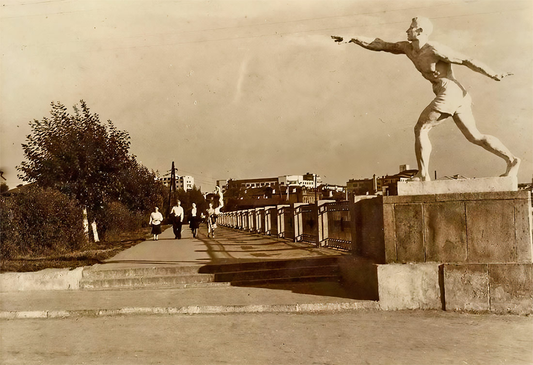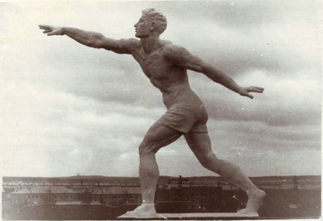 Данный снимок был опубликован на сайте Госкаталог со следующей атрибуцией: Фотография архитектурная художественная. «Скульптура дискобола на крыше Стадиона УЗТМ. Общий вид» Фотограф неизвестен. г. Свердловск. 1950 гг.