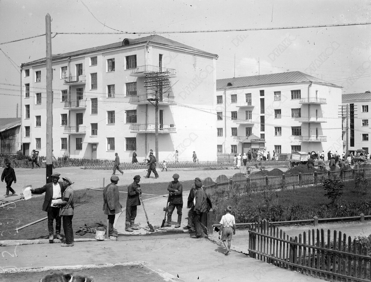 Сразу после сдачи: ![]() Виктор, мне давно знакомо это фото. Качество, правда, не позволяет судить о степени готовности дома №4, но мы знаем, что он был сдан в 1939 году, последним из трех домов Дворянского гнезда на ул. Культуры. Значит, снимок с голой землей на месте аллеи сделан не ранее 1939 г. Так что Александр и вы правы, с 1938 годом я действительно погорячился. :-) Но как тогда объяснить отсутствие вывесок на продуктовом магазине? Не мог же он 2-3 года стоять безымянным? Возможно, данный снимок был сделан ранней весной 1939 года (видны лепешки снега), а "мой" - в середине лета 1939-го, когда на аллее уже были высажены кустарники и деревья? |