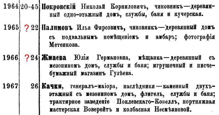 Цитата А вот и кеттереровский дом на Вознесенском 34 до перестройки. Совсем не похож. Мне кажется, что дом под номером 34 должен стоять ближе к магазину Метенкова (36). А помеченный вами дом больше похож на одноэтажный домик, стоящий справа от Кеттерера на исходной фотке. Т.е. я предполагаю, что это 32 номер. Кстати, последняя фотография каким годом датируется? |