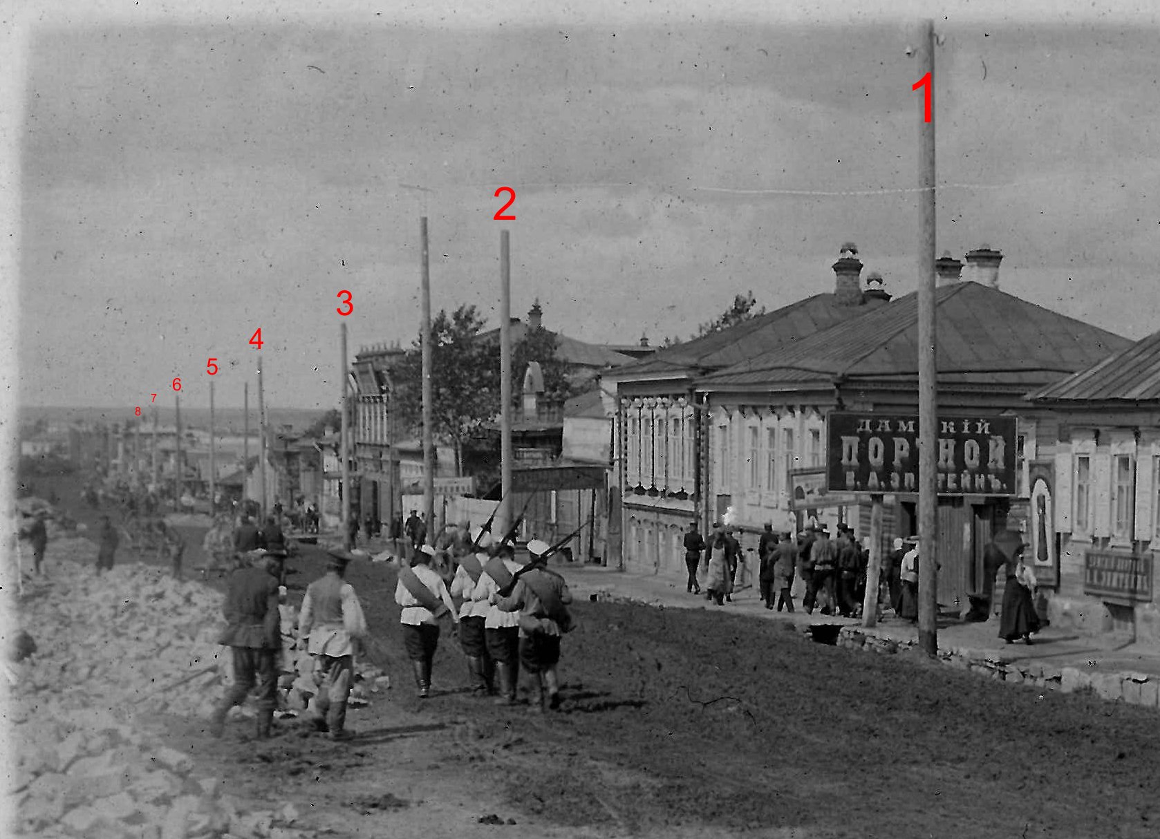 Между 4 и 5 столбами может быть перекрёсток. Косвенно на это указывает куча булыжника, единственная по правой стороне. А вот про улицу под углом не понял. Какая улица? вот эта улица у Метенкова и на Плане 1900 года Прикрепленные изображения