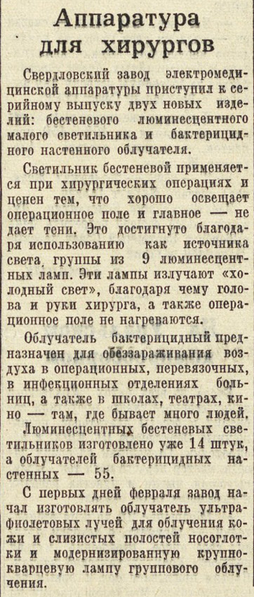 Свердловский завод электромедицинской аппаратуры. "Вечерний Свердловск", 11 февраля 1958г. ![]() |