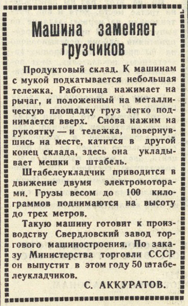 Метки: Свердловский завод торгового машиностроения, штабелеукладчик, С.Аккуратов. "Вечерний Свердловск", 11 февраля 1958г ![]() |