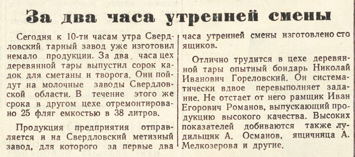 Метки: Свердловский тарный завод, Николай Иванович Гореловский, Иван Егорович Романов, А.Османов, А.Мелкозерова. "Вечерний Свердловск" 11 февраля 1958г. ![]() |