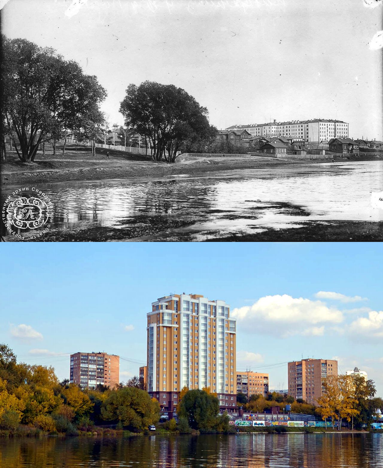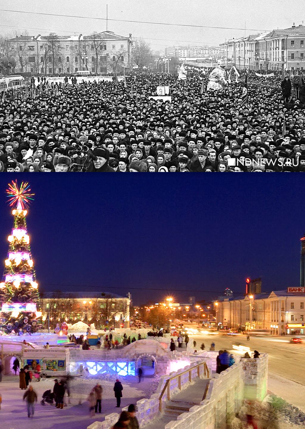 Наталья Зырянова FB: Угол Шейнкмана-Ленина. 1958 год и сейчас. На старом фото башня горсовета смотрится ближе, но это из-за различия технических характеристик объективов старого Зенита и нынешнего Самсунга