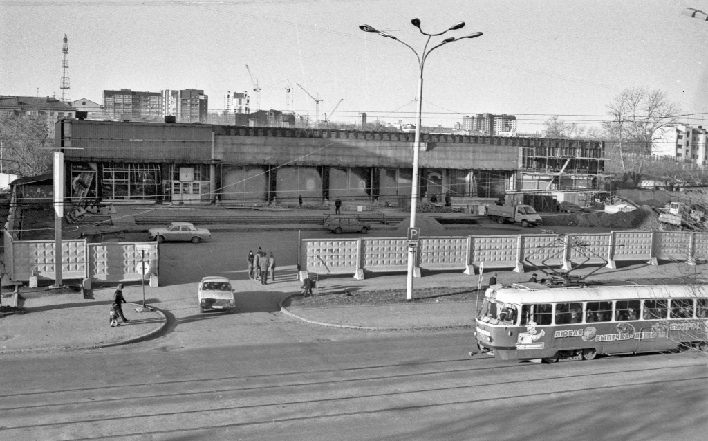 Это примерно 1998 г. Сделал фотосравнение со снимком 2013 года (кадр из гигапиксельной панорамы на сайте мэрии). На фото 1998 года просматриваются конструкции строившегося на этом месте универмага. Его строительство началось в 1985 году. Предполагалось, что в это здание переедут ЦУМ с Пассажем, которым уже не хватало торговых площадей. Строительство велось СУ-9 и СУ-17 треста "Свердловскгражданстрой" по проекту института "ГИПРОТорг" (г.Москва). Предполагалось построить 5-этажное здание размерами в плане 72х72 метра с торговой площадью 11 700 кв.м. В 1988 году стройка остановилась и была практически брошена без консервации. Помню свои тогдашние (1993 г.) впечатления от знакомства с проектом. Мне казалось, что магазинов и так достаточно. Незачем строить ещё и ещё. Кто бы мог подумать о грядущем двадцатилетии приоритетного строительства супер-гипер-мегамаркетов! |