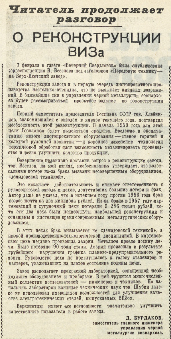 И.Веселов. "Вечерний Свердловск", 7 февраля 1958г. ![]() |