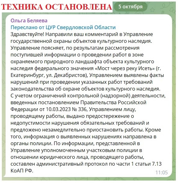 ❗ Важна ВАША ПОДДЕРЖКА ВСЕМ, КТО СЕЙЧАС НА БЕРЕГУ В сложившейся ситуации отказа от остановки работ в охранных зонах ОКН, выходных у различных ведомств, отсутствии реакции полиции, предлагаем отправлять ОБРАЩЕНИЯ ПРЕЗИДЕНТУ, о том что 🗣 в Екатеринбурге в зоне охраны объекта культурного наследия федерального значения Мост через реку Исеть на ул.Декабристов происходит уничтожение культурного слоя. Работы ведутся без документов о согласовании с Управлением Госохраны ОКН, государственной историко-культурной экспертизы. Ценные археологические артефакты вывозят на свалку. Полиция не принимает мер, местные и региональные органы власти бездействуют. 📍 звонок на телефон 8 800 200 23 16 (круглосуточно) или СМС на 2316 Так же есть электронная приёмная http://www.kremlin.ru/contacts Источник -------------------- |