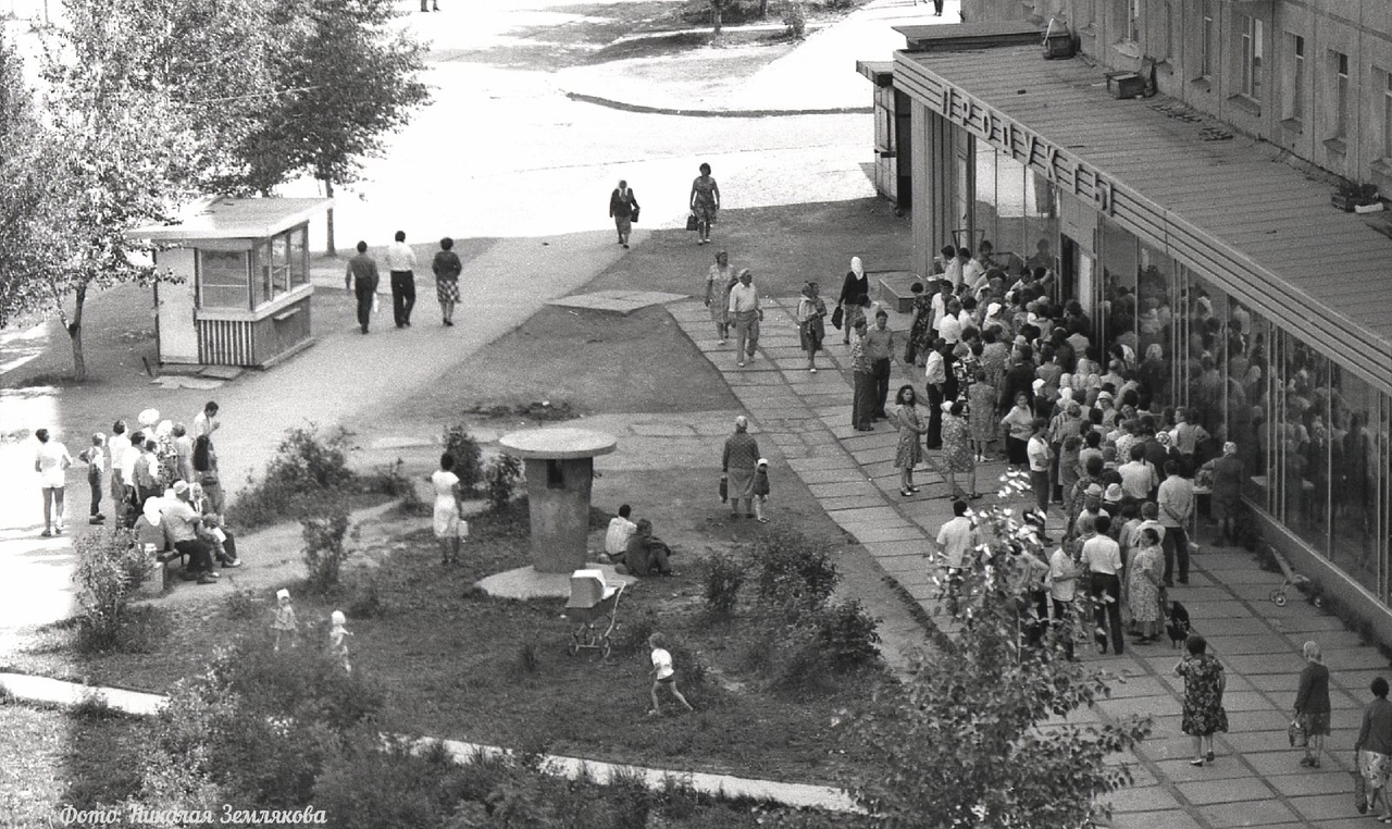 Лето 1982 года. Очередь перед открытием магазина "Продукты" на улице Советская, 12. Фото Николая Землякова. ![]() Источник |