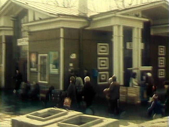 2. Сам вокзал многократно перекрашивался и примерно с середины 90-х за ним перестали следить. Он постепенно переходил в ветхое состояние. Много ли деревянному вокзалу надо? Вот, например, мой кадр 1999 года. Вокзал ещё раскрашен с подчеркиванием элементов декора и смотрится очень колоритно, хотя и видно, что он ветшает.
