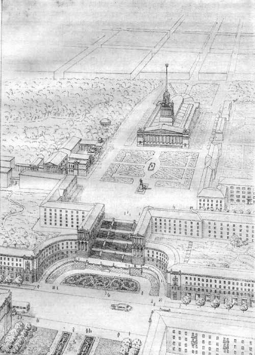 Проект улицы Свердлова, 1944 г. Архитекторы Г.А. Голубев, Е.В. Емельянов. В итоге на самой улице получилось нечто отдалённо похожее, а вот перспективу замыкают далеко не такие помпезные здания.