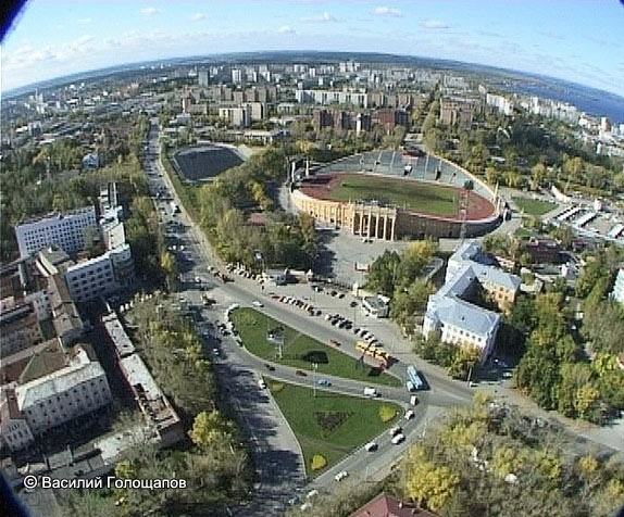 Центральный стадион. Вид в 1999 г. Ракурс не совпадает, но уж какой есть. Обратите внимание: на пересечении Репина-Малышева планироваось сделать круговое движение.