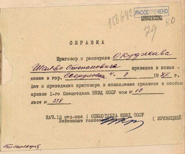 Приговор о расстреле Окуджава Шалво Степановича приведен в исполнение в гор. Свердловске 4.8.1937 г.
