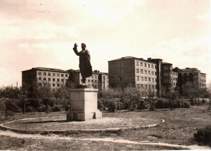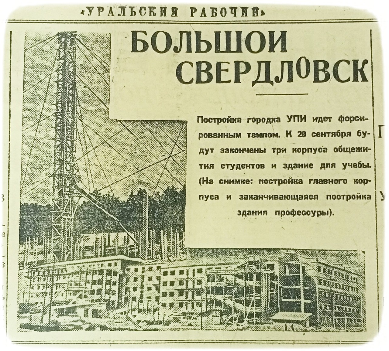 Общежития УПИ во Втузгородке и памятник Кирову. Повторить это фото в современном ландшафте невозможно, т.к. между памятником и общежитиями построено здание спорткомплекса УПИ. На месте памятника Кирову сейчас футбольное поле.