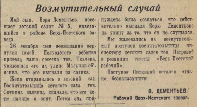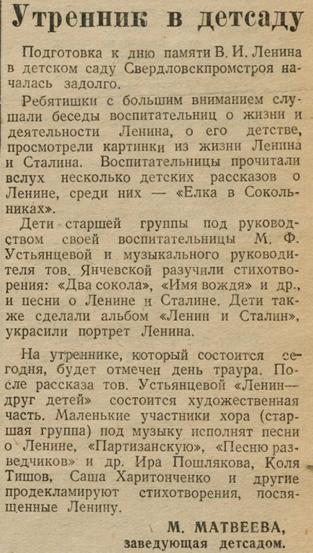 Детский сад №5. "Уральский рабочий". 11 января 1941г. ![]() Метки: Ткачёв, В.Дементьев, Борис Дементьев. |