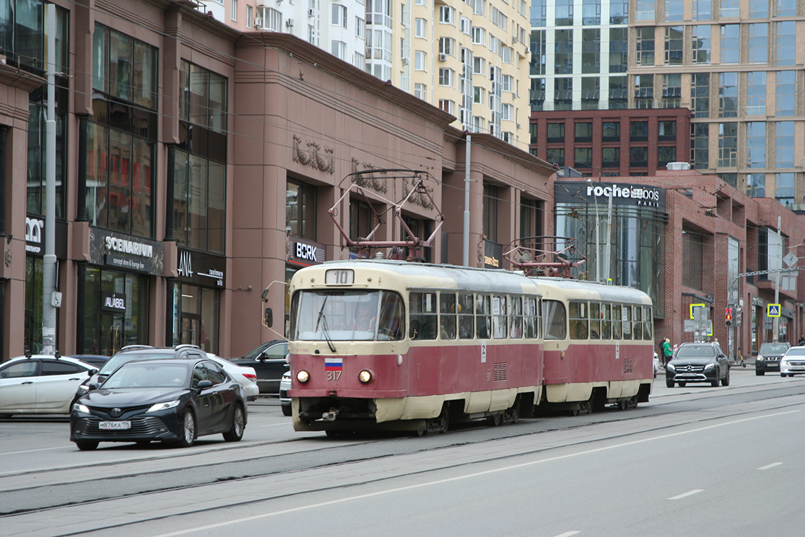 Трамвай Tatra T3SU (ИНВ.№317, СМЕ 317+318) следует по ул. Радищева. Маршрут 10.