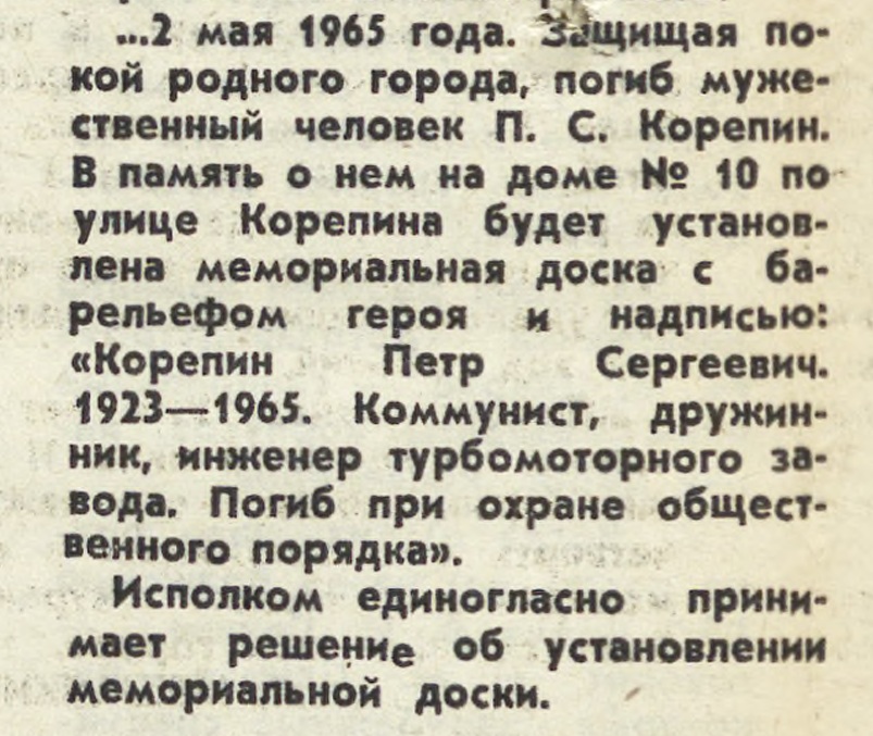 Речь об мемориальной доске на углу улиц Бабушкина 8 и Корепина 10 Если судить по коротким сведениям, схватка Корепина с преступником могла произойти в дворе этого дома. Печальная история. Он прошел ВОВ, потом трудился инженером на Турбинке, налаживал сложное производство, и выходил охранять родной район. Остались жена и дети.. Ну хоть улицу назвали именем героя. Прикрепленные изображения ![]() ![]() |