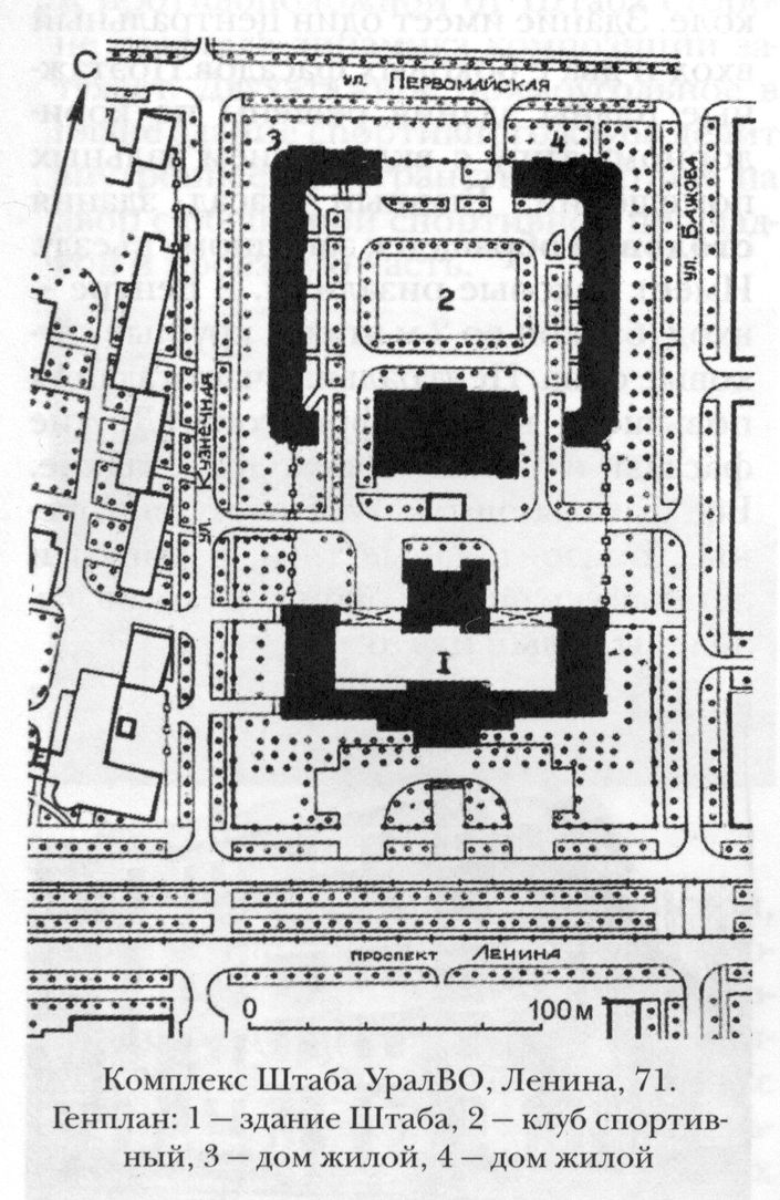 Комплекс Штаба Урал ВО. Комплекс построен по заказу Уральского Военного округа для его командного состава. Проект разработан в архитектурно-проектной мастерской № 1 Свердлгорсовета авторским коллективом архитекторов (А.Й. Вилесов, А.В. Десятков, Д.Н. Козяев, Н.Г. Нейфельд) под руководством A.M. Дукельского. В его композиции нашли отражение теоретические и практические разработки новой структуры квартала в советской архитектуре 1930-х годов (многофункциональность с активным использованием внутриквартального пространства, ансамблевость). Комплекс расположен в центре города, на прямоугольном в плане участке между проспектом Ленина, улицами Сони Морозовой, Первомайской и Бажова, в окружении современной ему застройки, рядом с «Городком чекистов». Решен в виде квартала полифункционального назначения. К главной городской магистрали — проспекту Ленина — обращен зданием Штаба, которое является одним из основных градостроительных акцентов проспекта. В состав комплекса входят: здание Штаба УралВО и столовой, два жилых дома, здание спортивного клуба, связанные композиционно и функционально. Композиционным центром комплекса является здание Штаба, возведенное в подчеркнуто крупном масштабе. Оно П-образное, объединено с двухэтажным зданием столовой переходами и образует с ними замкнутую прямоугольную композицию с внутренним двором в центре. Здание Штаба смещено от красной линии улицы в глубину квартала. В композиции комплекса играет роль доминанты, располагается по его оси. Занимает южную часть квартала. Перед главным фасадом разбит сквер с оградой из чугунных цепей, укрепленных на невысоких чугунных столбиках. Представляет собой четырехэтажное П-образное здание с сильно выступающим портиком на главном фасаде. Использованные в оформлении уличных фасадов здания Штаба центрально-осевые композиции и монументальные крупномасштабные формы придают представительность его облику. Фасады украшают дорические портики на высоких рустованных цоколях в виде арок из грубо сколотых брусьев гранита. Композиционным центром главного фасада является ризалит с сильно выступающим шестиколонным портиком, опирающимся на аркаду, завершенный тяжелым фронтоном типа аттика с бетонным рельефом на тему вооружения Красной армии (выполненный по эскизу A.M. Дукельского). Боковые фасады обращены к улицам Сони Морозовой и Бажова. Они фланкируются двухколонными портиками, опирающимися на арки. Оконные проемы уличных фасадов 1-го этажа имеют наличники с замковыми камнями. Окна 3-го этажа украшены прерывающимися наличниками с объемными сандриками и замковыми камнями. Фасады завершаются многопрофильным карнизом сильного выноса. Отделка фасадов выполнена красноватой камневидной штукатуркой вверху и розовым челябинским гранитом в цоколе. Здание имеет один центральный вход и два с боковых фасадов. Поэтажные планы здания решены по коридорному типу с включением зальных помещений. Главный фасад здания столовой обращен к западному въезду. Имеет боковые ризалиты. В центре — вход, балкон во 2-м этаже, круглые слуховые окна. Центральная часть здания повышена в виде фронтона. Другие фасады и стены переходов гладкие. Все фасады оштукатурены и покрашены. Горизонтальные тяги, карнизы и лепные украшения окон переходов выделены белым цветом. От здания Штаба прос