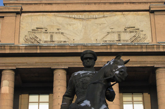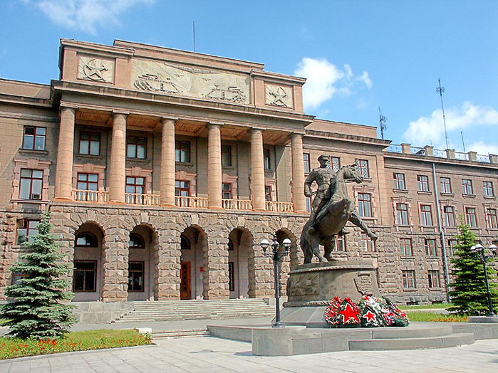 Гид: архитектор Анатолий Тищенко – Архитекторы часто следуют за чужой мечтой и материализуют ее. Но если эта мечта – социальная утопия, то рождаются утопичные проекты, которые просто не в силах воплотить никакое общество. Они потрясают своим масштабом и гипнотизируют сознание: всем кажется, что это возможно, но проходят годы, а мечты так и остаются утопией, хотя все усиленно трудятся над разработкой планов и фасадов, доводя их до совершенства. Может, замысел заказчика был как раз в этом – занять творческие мозги и силы бессмысленным проектированием? В столице 5 декабря 1931 года взорвали Храм Христа Спасителя, чтобы на его месте возвести Дворец Советов – символ нового общества. И тут развернулось поистине грандиозное творчество, граничащее с болезнью: несколько туров архитектурного конкурса, лучшие архитекторы страны и зарубежья, куча проектов! Но причем тут наш город, спросите вы? Дело в том, что свет этого проекта достиг пределов Уральских гор. Пройдите к зданию штаба Уральского военного округа и встаньте точно напротив памятника маршалу Жукову. Посмотрите ему в лицо и дальше за него, на фронтон штаба. Обратите внимание на центр композиции барельефа. От чего разлетаются самолеты и движутся танки, от чего исходят лучи? Да, именно от УТОПИИ – от проекта Дворца Советов. На барельефе изображен проект архитекторов Б.М. Иофана, В.А Щуко, В.Г. Гельфрейха, точнее, одна из версий окончательного варианта. Но в реальной жизни архитекторы занимаются реальными вещами, воплощенными в материалах и трудозатратах. Квартал штаба УрВО – как раз такой проект, реализованный для функционирования военной структуры государства. Комплекс состоит из самого здания Штаба и здания столовой за ним, двух жилых домов, замыкающих каре квартала, и спортивного клуба армии в центре комплекса. Есть еще дворовое пространство и небольшой парк перед штабом с цепной оградой и чугунными тумбами, увенчанными звездами. Этот парк – архитектурная пауза, которая спокойно и с достоинством презентует зрителю фасад Штаба, дает возможность подумать, переключиться на другое восприятие. А кроме того, словно приглашает небо поучаствовать в архитектурном замысле. Отличным дополнением к комплексу стал памятник Г.К. Жукову, установленный в 1995 году. Комплекс зданий, построенный в 1937-1940 годы, запроектировал коллектив под руководством архитектора А.М.Дукельского. Мастер, переболев утопичным проектом, вернулся к обычной работе и сделал все грамотно: здание штаба, как крепость, внушительно трактует образ непобедимой Красной армии. Жилье командирского состава максимально приближено к месту работы, а для поддержания физической формы универсальных солдат внутри квартала расположено здание спортивного клуба. Короткие связи всего комплекса экономят не только личное время, но и время мобилизации командного центра в боевое состояние. Хороший проект предполагает и красивые детали: барельеф портика и колонны, лоджии под арками, звезды над боковыми входами, бутовые камни цоколя и посадки перед зданием прекрасно дополняют этот соподчиненный центральной оси симметрии квартал. Конечно, и внутри здания штаба есть что посмотреть, но туда мы не попадем – все же это Штаб Округа, и режим секретности начинается сразу за входными дверями. Утопичные проекты оставляют глубокий шрам в сознании 