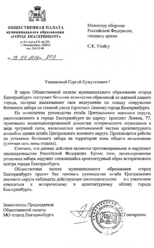 Однако! Заборчик планируют сделать 2,5 метра высотой!.. Ограждай и властвуй В Екатеринбурге разрастается скандал в связи с возведением забора вокруг штаба Центрального военного округа, расположенного в самом центре города. Появление нового ограждения военные объясняют заботой о собственной безопасности. Однако действия руководства ЦВО не встретили понимания ни у местных властей, ни у общественности. Как выяснилось, строительные работы на территории архитектурного памятника не были согласованы ни с администрацией Екатеринбурга, ни с МУГИСО. Военные просто поставили органы власти перед фактом. Против вмешательства в архитектурный облик центра города выступают также специалисты и общественность, мнением которых военные также не поинтересовались. Разбираться с самовольным строительством стены на территории исторического памятника предстоит прокуратуре. Изменения в архитектурном облике штаба Центрального военного округа (ЦВО), построенного в 1937 году, жители Екатеринбурга начали замечать на прошлой неделе. Сначала исчезли столбики и цепи, которые огораживали здание 77 лет. На их месте рабочие начали заливать бетонные блоки. Как пояснили в пресс-службе ЦВО, на готовящихся постаментах будет установлена решетка высотой около 2,5 метров. «Замена вызвана общим благоустройством территории. Собственно говоря, оборудование военных объектов нам предписывает такие ограждения. В этом объекте совмещены охранные и декоративные функции. Ограждение будет выполнено в том стиле, в котором выполнено здание», — пояснил УрБК начальник пресс-службы ЦВО полковник Ярослав Рощупкин. ![]() Руководство ЦВО планирует установить вокруг исторического памятника двухметровый забор Демонтированные столбики и цепи, как заверяют военные, будут перемещены к Дому офицеров. По словам Ярослава Рощупкина, руководство ЦВО известило о своих планах администрацию Екатеринбурга. Однако, как следует из реакции городских властей, военные уведомили о строительстве в каком-то своем формате — без согласования на проведение работ. «В воскресенье, 21 сентября, нанятые командованием ЦВО строители не прекращали процесс сооружения уродливого новодела и полным ходом вели заливку бетонного основания забора с западной стороны штаба ЦВО. Таким образом, процесс незаконного сооружения забора в районе комплекса исторических зданий по адресу: проспект Ленина, 71 в Екатеринбурге ведется полным ходом, несмотря на протест со стороны администрации уральской столицы и екатеринбургской городской Общественной палаты», — сообщает пресс-служба администрации Екатеринбурга. Министерство по управлению госимуществом Свердловской области, отвечающее за объекты культурного наследия, к которым относится штаб ЦВО, и вовсе оставалось в неведении до начала строительных работ. В МУГИСО поясняют, что еще в 2006 году военные дали обещание Роскомнадзору проводить любые строительные работы только с разрешения профильных ведомств. На деле же о возведении забора в министерстве узнали по результатам собственной проверки. «На сегодняшний день министерством по управлению государственным имуществом Свердловской области, являющим уполномоченным органом по охране объектов культурного наследия, такого разрешения не выдано, данные работы проводятся несанкционированно», — сообщили УрБК в 