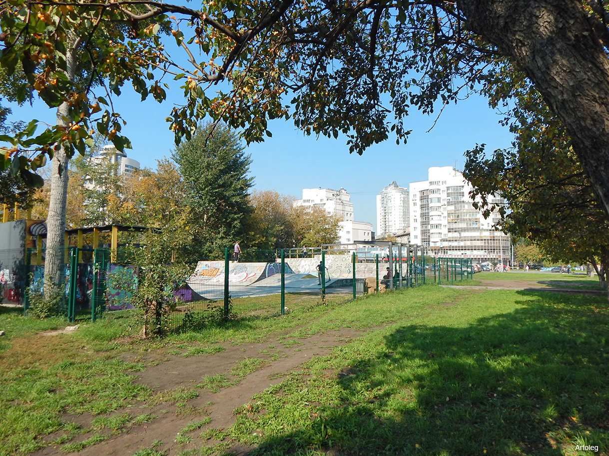 Скейт-парк у Дворца молодежи. Бетонный парк (Plaza). Справа - воркаут-площадка.