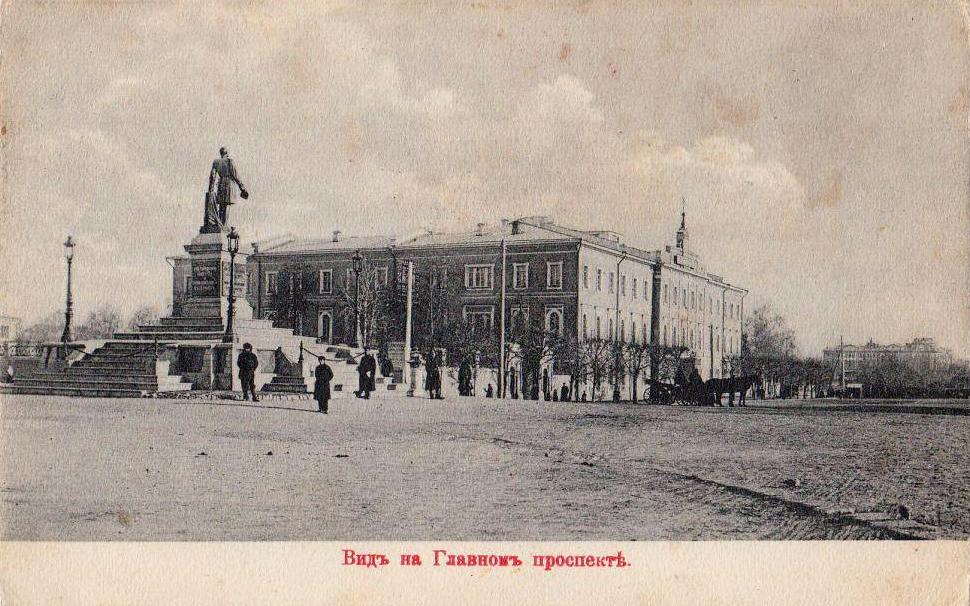 Восточная часть города и Памятник Петру I. Хромолитография. Открытка в стиле "Грюсс". 1890-гг или начало XX в.