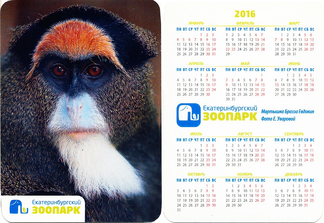 Карманный календарик "Екатеринбургский зоопарк. Мартышка Бразза Евдокия. 2016 г."